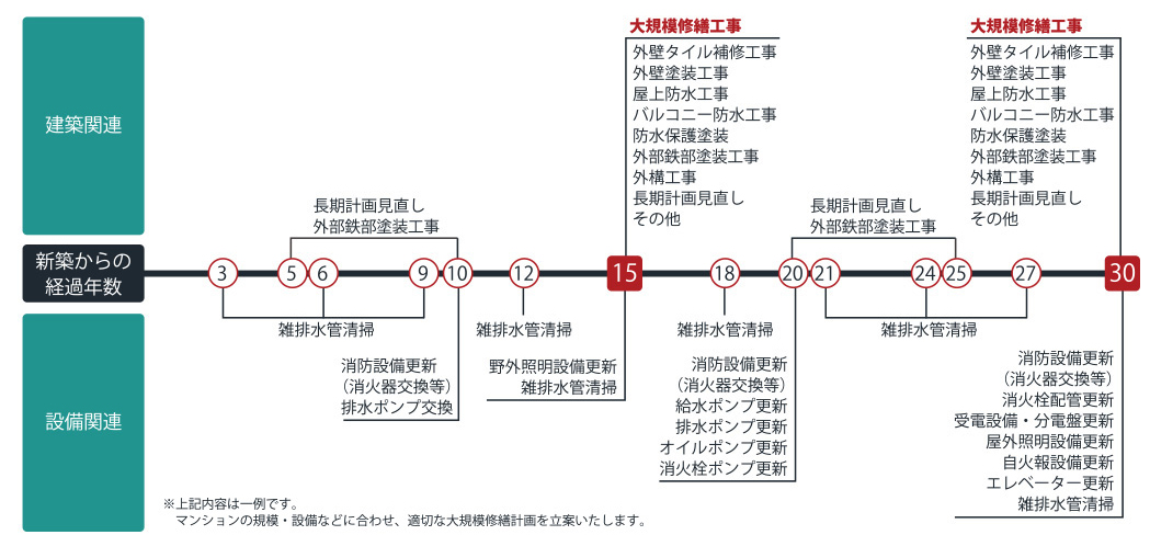 マンションは年月とともに少しずつ劣化していきます。適切な時期に適切な方法で修繕を行なうことで、大切なお住まいの快適性と資産価値を維持するよう、長期的サポートを行ないます。