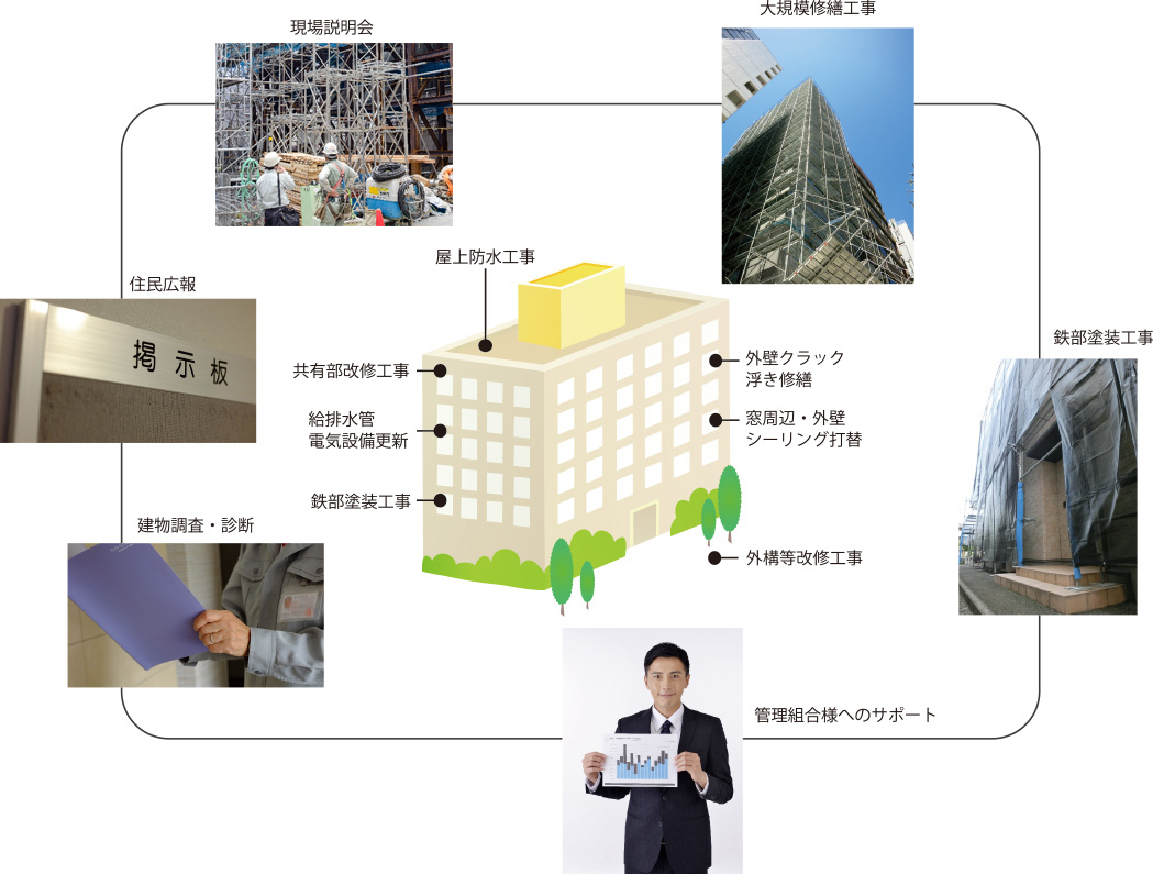 また大規模修繕工事に際しては、管理組合様の大切な費用負担を極力抑え、住民の合意形成を図りながら、公明正大で透明性が高い工事が実施できるよう、管理組合様を支援いたします。