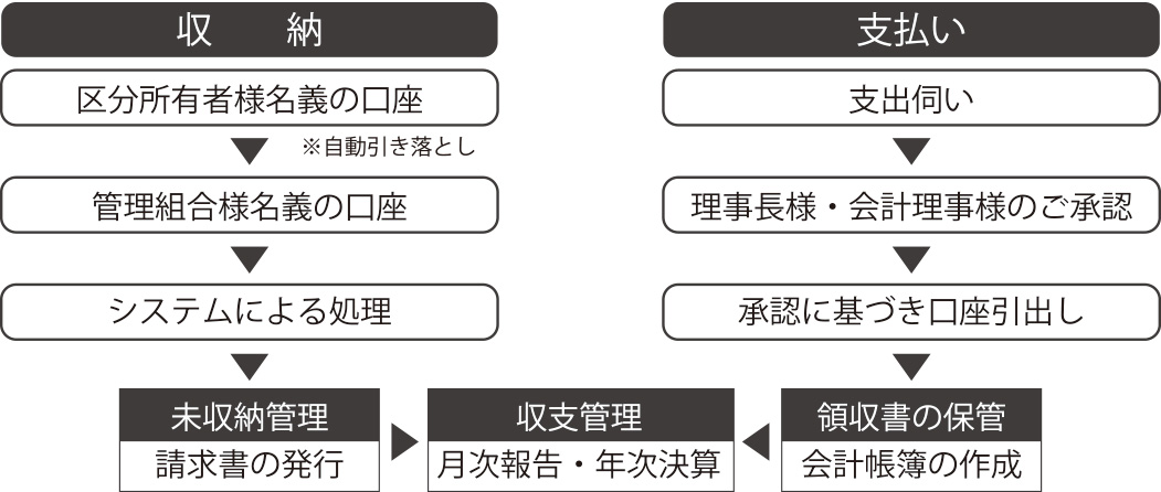 - 全て管理組合様名義の口座を使用する会計フローです。透明性があり、最もリスクの